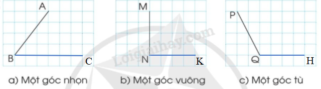 Trong các góc sau, góc nào là góc nhọn, góc vuông, góc tù, góc bẹt? Chỉ ra cách vẽ thêm 1 đoạn thẳng để được góc theo