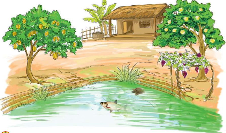 Nhà cô Nhã ở bờ hồ. Hồ nhỏ, nhà nho nhỏ. Hồ có cá mè, ba ba. Nhà có na, nho, khế.