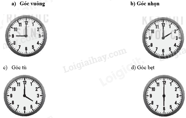 a) Dùng ê ke kiểm tra rồi cho biết góc nào là góc vuông, góc nào là góc bẹt. Quay kim trên mô hình đồng hồ để được: a) Góc vuông