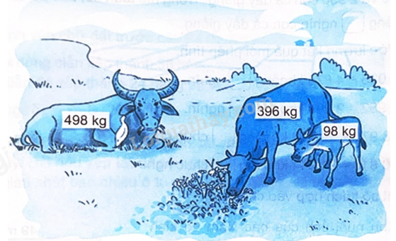 Số cân nặng của mỗi con trâu, con bò, con bê được ghi trong hình dưới đây.
