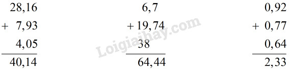 \(28,16 + 7,93 + 4,05\)                \(6,7 + 19,74 + 38\)               \(0,92 + 0,77 + 0,64\)