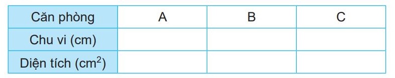 a) Quan sát tranh, tìm độ dài của từng căn phòng rồi tính chu vi và diện tích.