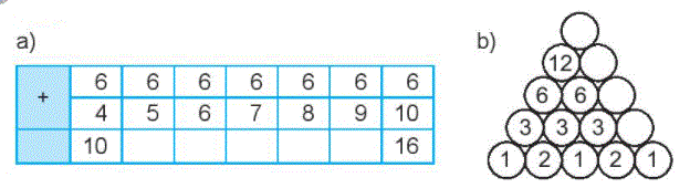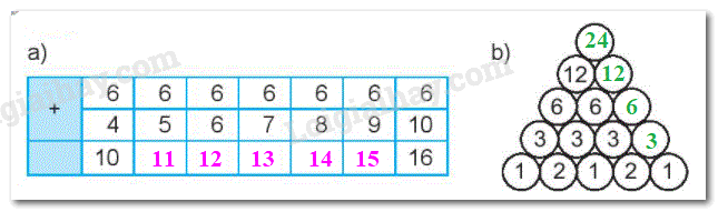 – Quan sát hình vẽ ta thấy tổng 2 số ở hàng dưới bằng số ở giữa thuộc hàng trên. Từ đó ta điền được các số còn thiếu.