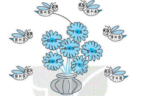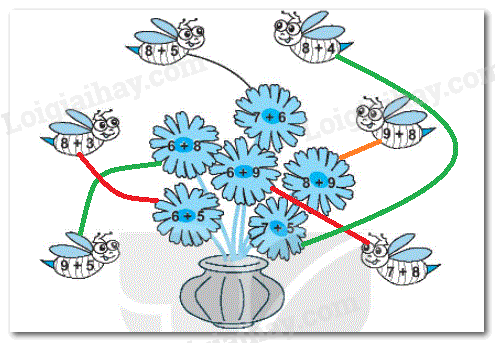 Tính nhẩm kết quả phép cộng trên mỗi con ong và mỗi bông hoa rồi nối những phép tính có cùng kết quả.