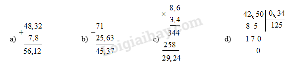 a) 48,32 + 7,8                    b) 71 – 25,63                        c) 8,6 x 3,4                  d) 42,5 : 0,34