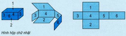 Hình hộp chữ nhật có 6 mặt (như hình vẽ): hai mặt đáy (mặt 1 và mặt 2) và bốn mặt bên (mặt 3, mặt 4, mặt 5 và mặt 6) đều là hình chữ nhật. Mặt 1 bằng mặt 2; mặt 3 bằng mặt 5; mặt 4 bằng mặt 6.