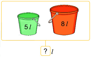 Thực hiện phép cộng với 2 số ghi trên mỗi chiếc xô và giữ nguyên đơn vị  \(l\) ở kết quả vừa tìm được.