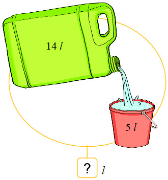 – Để tìm số lít nước còn lại trong can ta lấy số lít nước ghi trên can trừ đi số lít nước rót ra xô.
