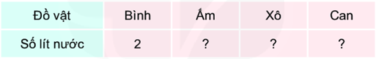 Tính tổng số lít nước ở các ca để tìm số lít nước mà mỗi đồ vật đựng được.