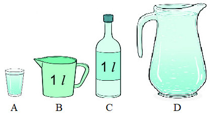 Vì: Cốc A đựng ít hơn 1 \(l\) nước, bình D đựng nhiều hơn 1 \(l\) nước, do đó cốc A đựng ít nước hơn bình D.