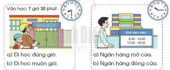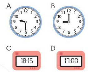 Xem giờ trên mỗi đồng hồ rồi chọn câu thích hợp với thời gian trên đồng hồ đó.