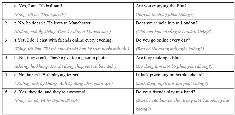 (Nối câu hỏi 1-6 với câu trả lời a-f.)