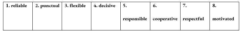 1. Martha is a(n) _____ employee, so her boss can trust her with many projects in the company.