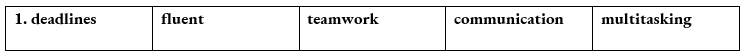 (Điền vào mỗi chỗ trống với communication, multitasking, teamwork, deadlines or fluent. Sau đó nghe và kiểm tra.)