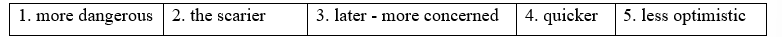 5 Lena’s _______ than she used to be- nowadays, she always looks on the dark side. (optimistic)