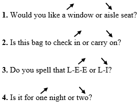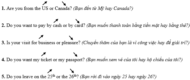 (Khi chúng ta đặt câu hỏi mà có hai lựa chọn, chúng ta sử dụng ngữ điệu tăng và giảm. Ngữ điệu tăng ở lựa chọn đầu tiên và giảm ở lựa chọn thứ hai.)