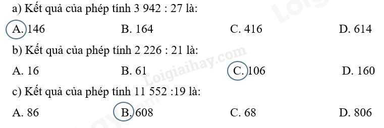 Thực hiện tính kết quả mỗi phép tính rồi chọn đáp án thích hợp.