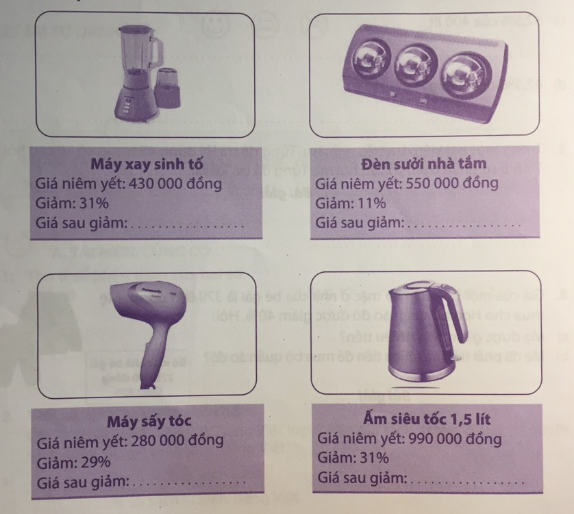 – Tìm số tiền được giảm = Giá niêm yết : 100% x số phần trăm được giảm