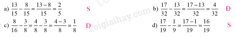 Kiểm tra lại cách cộng trừ phân số rồi xét tính đúng sai của từng câu.