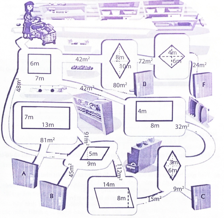 Tính diện tích mỗi hình tứ giác trên đường đi để tìm đường ra khỏi siêu thị.