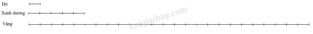 Tỉ số giữa màu đỏ và màu xanh dương là 1 : 5; Tỉ số giữa màu xanh dương và màu vàng là 1 : 5 nên ta coi màu đỏ là 1 phần, màu xạnh dương là 5 phần, màu vàng là 25 phần bằng nhau.