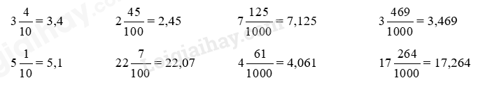 Viết các số thập phân sau thành hỗn số có chứa phân số thập phân: