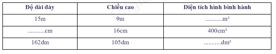 – Độ dài đáy = Diện tích hình bình hành : chiều cao