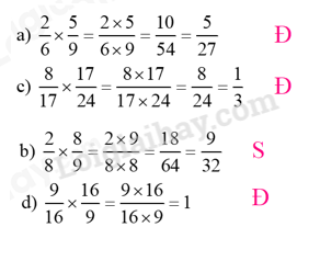 Kiểm tra cách nhân hai phân số để tìm ra đúng, sai của từng câu trong đề bài.