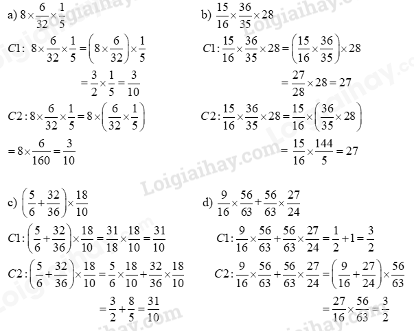 \({\text{b) }}\frac{{15}}{{16}} \times \frac{{36}}{{35}} \times 28\)