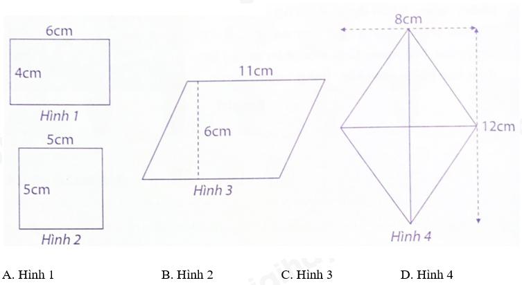 Tính diện tích từng hình rồi so sánh để tìm ra hình có diện tích lớn nhất.