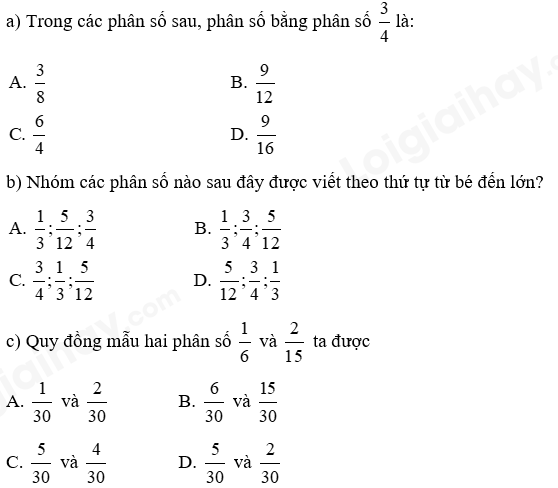 Khoanh vào chữ đặt trước câu trả lời đúng: a) Trong các phân số sau, phân số nào bằng phân số 3/4 là: Viết các phân số sau thành phân số thập phân: 7/2 …