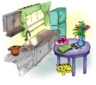 (Con nghĩ nó nằm dưới bàn ăn trong nhà bếp.)