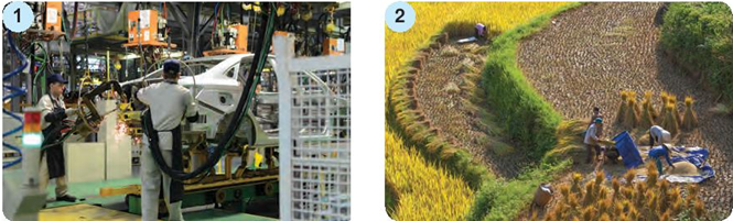 Tranh 2: Hoạt động thu hoạch lúa, sản xuất lúa gạo: Cung cấp lương thực, thực phẩm, phục vụ cho cuộc sống hằng ngày.