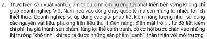 2. Việc thực hiện sản xuất xanh sẽ mang lại lợi ích cho doanh nghiệp và xã hội như: Tiết kiệm chi phí, hạ giá thành sản phẩm, tăng lợi thế cạnh tranh, có cơ hội bước chân vào những thị trường “khó tính” khi tạo ra được những sản phẩm “xanh”, thân thiện với môi trường.