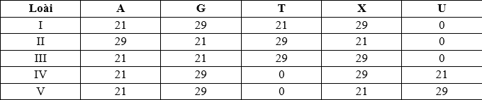 II. đúng. Loài IV và V có vật chất di truyền là ARN vì có U, không có T. Loài IV có A=U, G=X nên là mạch kép, loài V có A≠U, G≠ X nên là mạch đơn