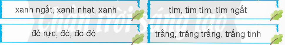Sắp xếp các tính từ trong mỗi nhóm sau theo thứ tự tăng dần mức độ gợi tả màu sắc.
