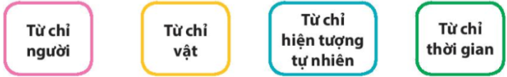 + Danh từ chỉ thời gian: ngày, đêm, mùa xuân, mùa hạ, mùa thu, mùa đông, ngày mai, hôm nay,….