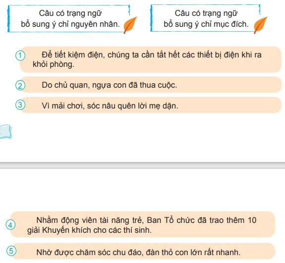 – Câu có trạng ngữ bổ sung ý chỉ nguyên nhân: 2, 3, 5.