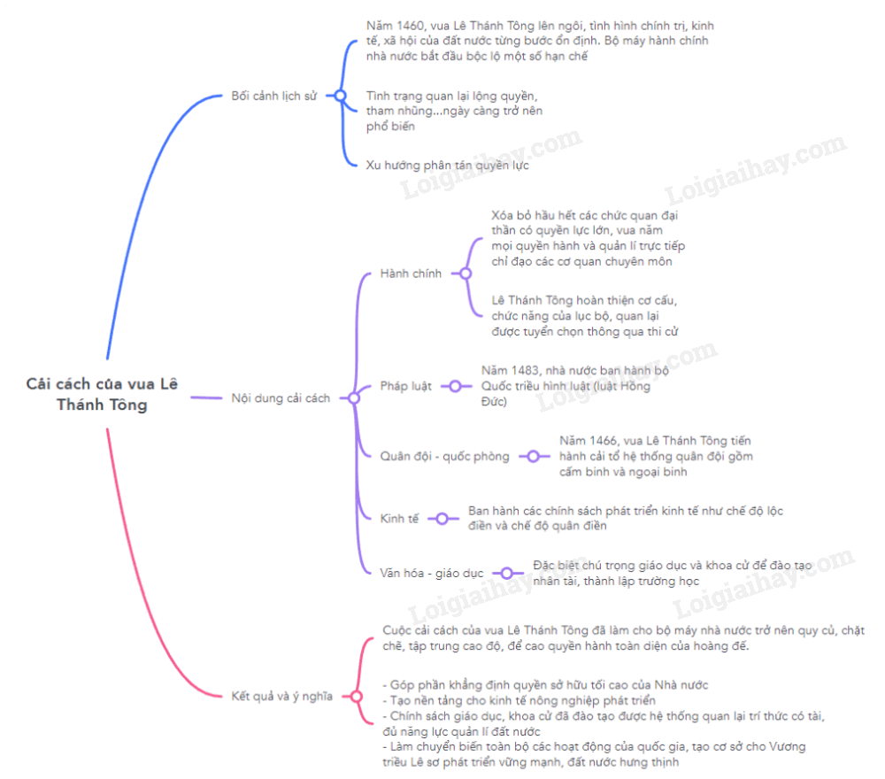 Lập sơ đồ tư duy về bối cảnh lịch sử, nội dung chủ yếu và kết quả, ý nghĩa cải cách của vua Lê Thánh Tông