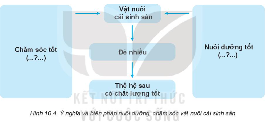 Đọc nội dung mục IV kết hợp quan sát Hình 10.4, nêu ý nghĩa và biện pháp nuôi dưỡng, chăm sóc vật nuôi cái sinh sản.
