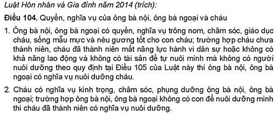 – Ông bà nội, ông bà ngoại có quyền, nghĩa vụ trông nom, chăm sóc, giáo dục cháu, sống mẫu mực và nêu gương tốt cho con cháu; trường hợp cháu chưa thành niên, cháu đã thành niên mất năng lực hành vi dân sự hoặc không có khả năng lao động và không có tài sản để tự nuôi mình mà không có người nuôi dưỡng theo quy định tại Điều 105 của Luật này thì ông bà nội, ông bà ngoại có nghĩa vụ nuôi dưỡng cháu.