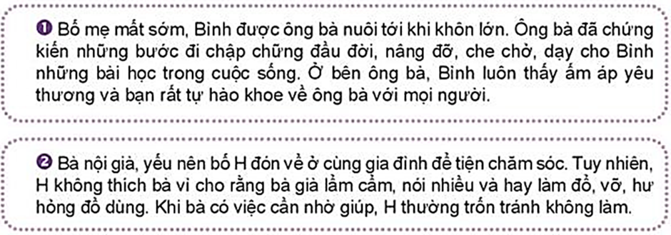– Đọc thông tin và nhận xét về tình cảm và việc làm của ông bà Bình, H trong các trường hợp trên từ đó chỉ ra ai thực hiện đúng/không đúng quyền và nghĩa vụ giữa ông bà và cháu.
