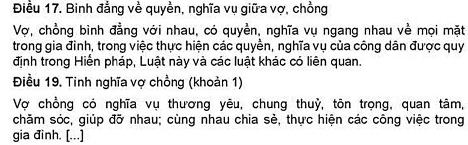 b) Vợ, chồng bình đẳng với nhau, có quyền, nghĩa vụ ngang nhau về mọi mặt trong gia đình; vợ chồng có nghĩa vụ thương yêu, chung thủy, tôn trọng, quan tâm, chăm sóc, giúp đỡ nhau; cùng nhau chia sẻ, thực hiện các công việc trong gia đình;…