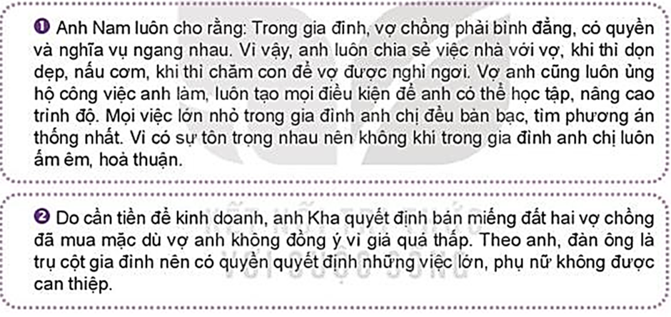 – Đọc thông tin và nêu được quyền và nghĩa vụ giữa vợ và chồng trong hai trường hợp.