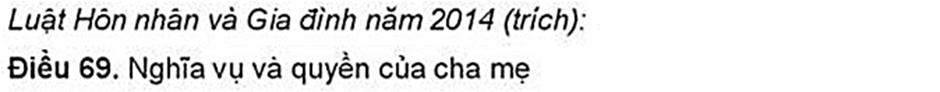 – Cha mẹ có quyền và nghĩa vụ nuôi dạy con thành công dân tốt, bào vệ quyền và lợi ích hợp pháp của con; không phân biệt đối xử giữa các con; không ngược đãi, ép buộc con làm điều trái pháp luật, trái đạo đức,.