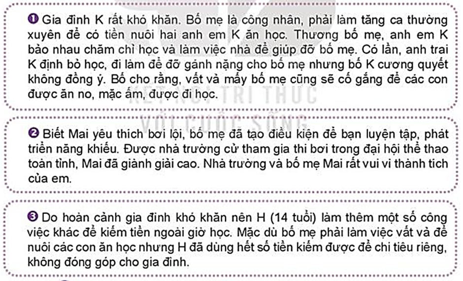– Trường hợp 1: Nói về quyền và nghĩa vụ của cha mẹ nuôi dạy con thành công dân tốt. Bố mẹ K đã thực hiện đúng khi dù hoàn cảnh có khó khăn cũng vẫn cố gắng lo cho con được đi học.