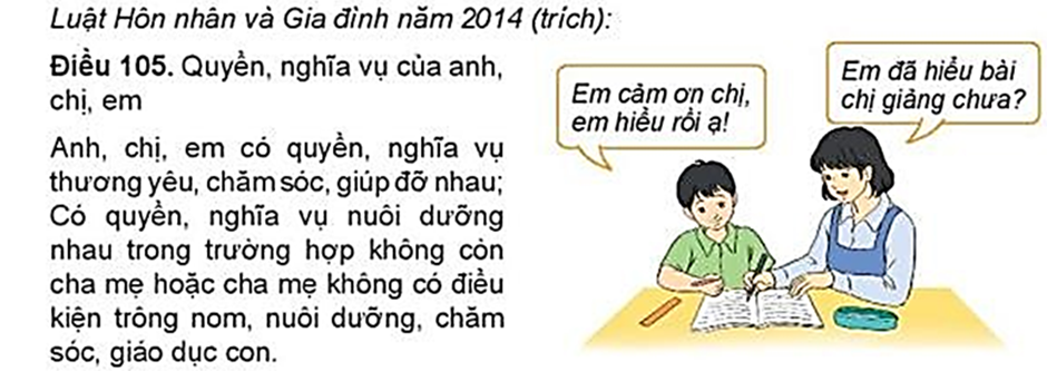 b) Giữa anh chị em trong gia đình có quyền, nghĩa vụ yêu thương, chăm sóc, giúp đỡ nhau, nuôi dưỡng nhau trong trường hợp không còn cha mẹ,…