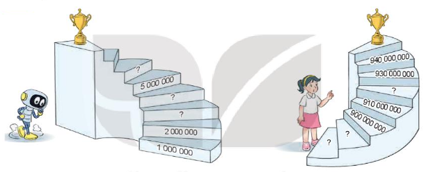 – Cầu thang bên phải: Đếm thêm 10 000 000 đơn vị rồi điền số còn thiếu vào chỗ trống.
