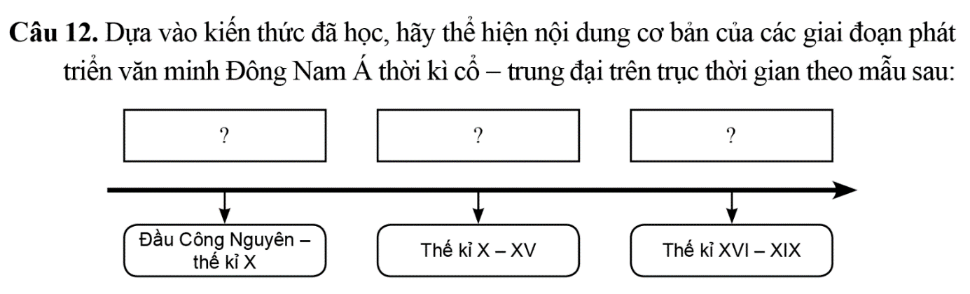 Từ kiến thức đã được học từ Bài 11 – Lịch Sử 10 và hiểu biết của bản thân, ta có thể thể hiện nội dung cơ bảnc ủa các giai đoạn phát triển nền văn minh Đông Nam Á thời kỳ cổ – trung đại như sau: