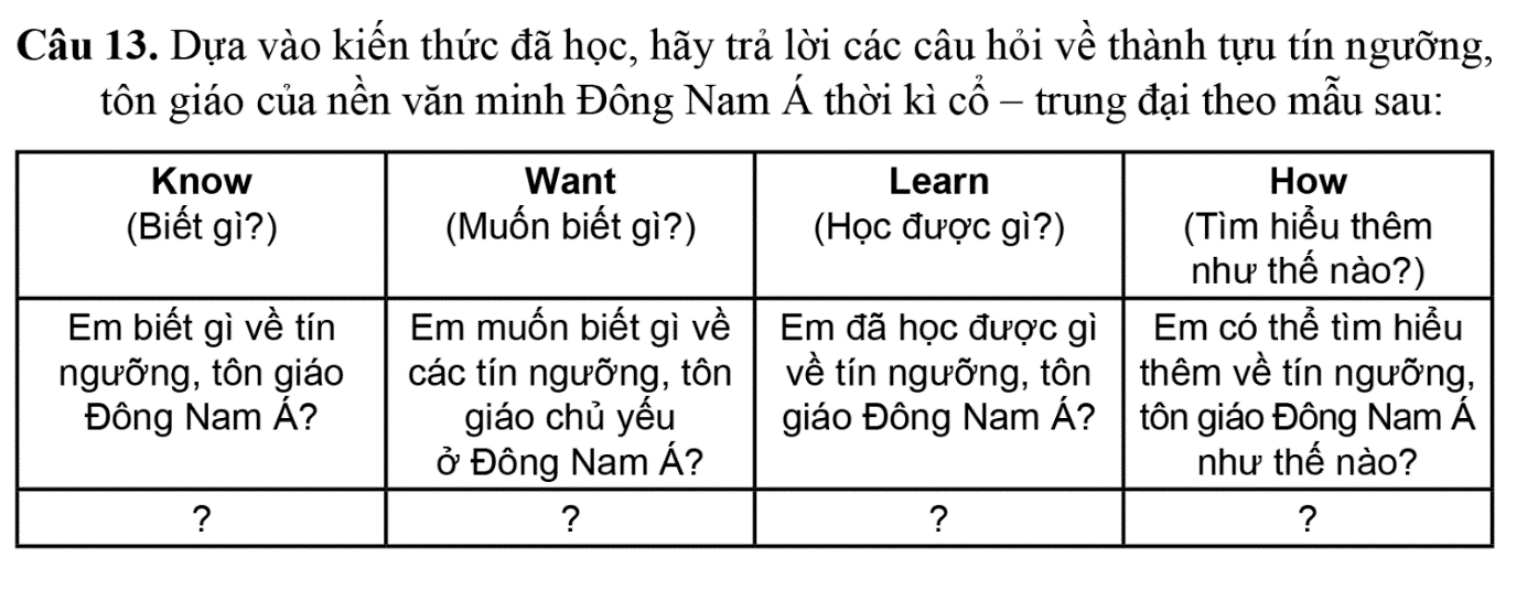 Từ kiến thức đã được học từ Bài 11 – Lịch Sử 10 và hiểu biết của bản thân, ta có thể trả lời các câu hỏi về thành tựu tín ngưỡng, tôn giáo của nền văn minh Đông Nam Á thời kỳ trung – cổ đại như sau: